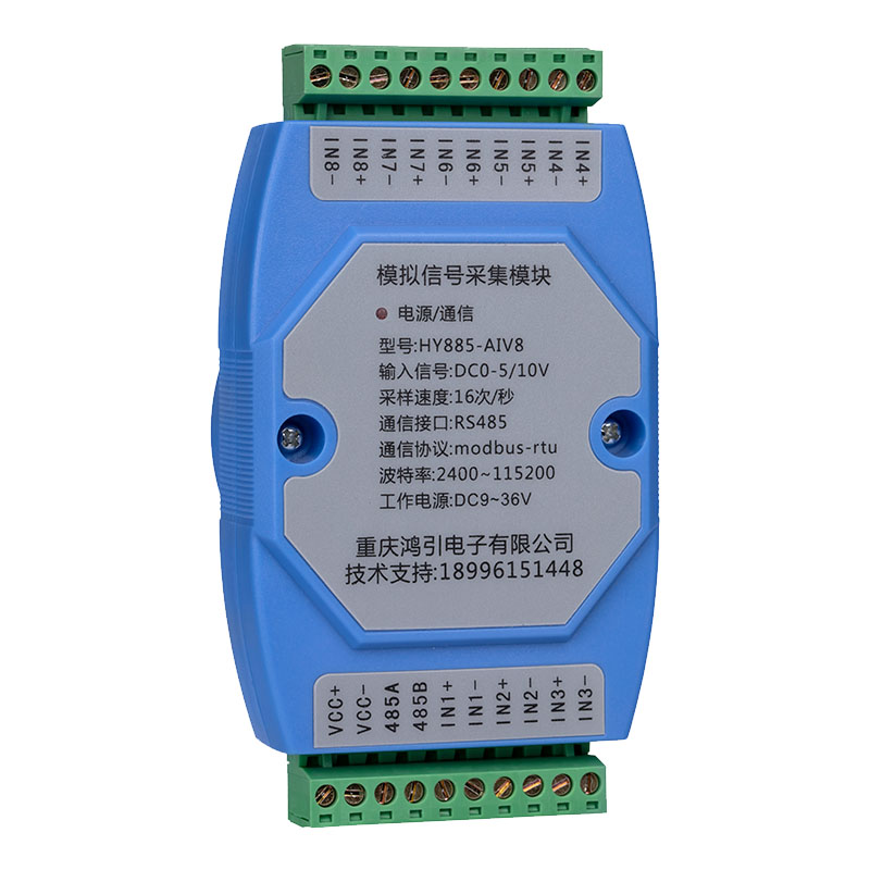 采用進(jìn)口16位模數(shù)轉(zhuǎn)換芯片,把8路DC0~5V(或10V)模擬信號(hào)轉(zhuǎn)換成數(shù)字信號(hào),通過(guò)RS485接口輸出,DC0~5V(或10V)輸入對(duì)應(yīng)的數(shù)字量為0-20000。DC0-5V(或10V)模擬信號(hào)輸入與工作電源、RS485之間隔離。RS485采用標(biāo)準(zhǔn)Modbus-rtu協(xié)議,可與各種組態(tài)軟件、PLC、觸摸屏聯(lián)網(wǎng)。出廠預(yù)設(shè)RS485通信參數(shù):模塊地址1,波特率9600,8個(gè)數(shù)據(jù)位,無(wú)校驗(yàn)位,1位停止位,用戶通過(guò)上位機(jī)參數(shù)設(shè)置軟件修改通信參數(shù)。