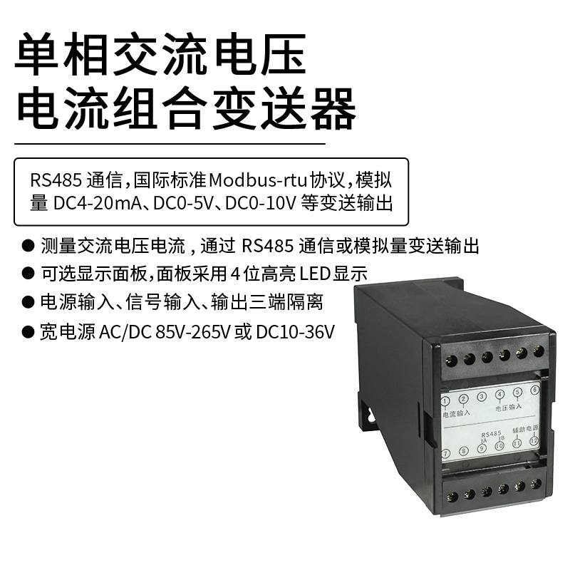 HY194-BS4UI單相交流電壓電流組合變送器,是一種把輸入的交流電壓電流隔離轉(zhuǎn)換成線性直流模擬信號輸出(2路模擬量輸出,1路對應電壓,1路對應電流)或RS485數(shù)字通信接口輸出。模擬量可選:DC0~20mA、DC4~20mA、DC0~5V、DC1~5V、DC0~10V等變送輸出。RS-485數(shù)字通訊接口,采用國際標準MODBUS-RTU通訊協(xié)議,可與各種PLC、HMI、組態(tài)軟件實現(xiàn)組網(wǎng)。