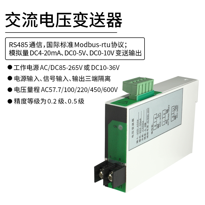 單相交流電壓變送器,是一種將電網(wǎng)中的電壓參數(shù),經(jīng)隔離變送成線(xiàn)性的直流模擬信號(hào)的裝置。模擬量可選:DC0~20mA、DC4~20mA、DC0~5V、DC0~10V等變送輸出。高精度測(cè)量單相交流電壓,精度達(dá)0.5%。RS485通信接口,采用國(guó)際標(biāo)準(zhǔn)Modbus-rtu通訊協(xié)議,可與各種PLC、HMI、組態(tài)軟件實(shí)現(xiàn)組網(wǎng)。