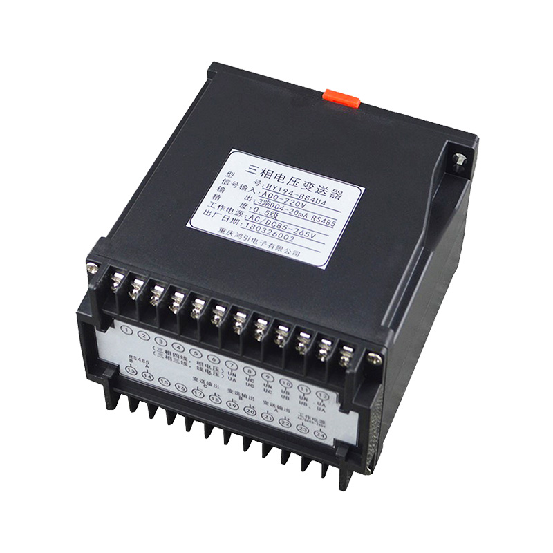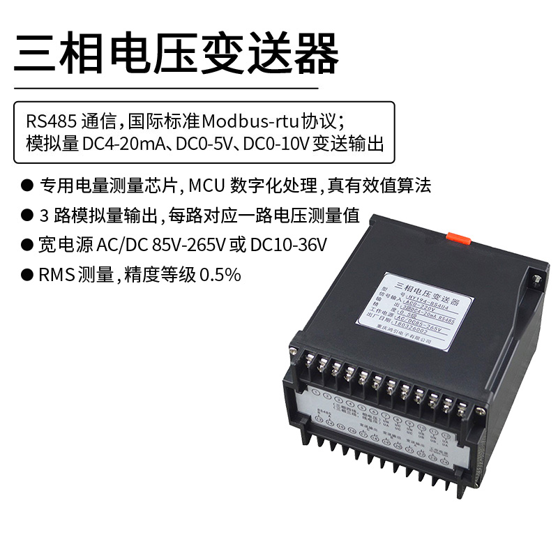 三相電壓變送器,通過專用電量芯片采樣,CPU 數字化處理,真有效值算法,高精度的測量三相電壓,隔離轉換成線性直流標準模擬信號輸出或RS485數字通信接口輸出。模擬量可選:DC0~20mA、DC4~20mA、DC0~5V、DC1~5V、DC0~10V等變送輸出;RS-485數字通訊接口,采用國際標準MODBUS-RTU通訊協議,可與各種PLC、HMI、組態(tài)軟件實現組網。