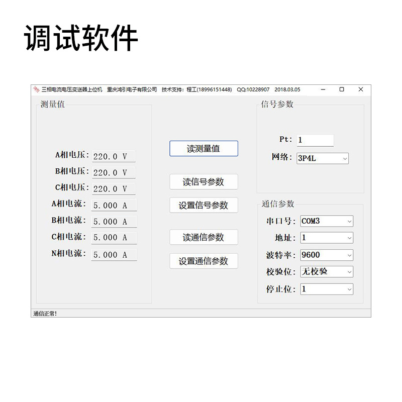 通過上位機調試軟件,可以讀出三相電壓測量值;可以設置電壓變比,接線方式;可以設置電壓變送器的通信地址,波特率,數據格式等。上位機調試軟件界面: